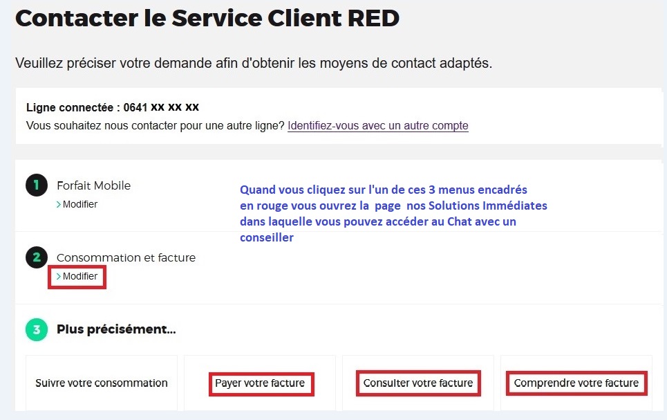 A partir de cette page cliquez sur Suspendre la ligne. Une analyse personnalisée de votre situation sera réalisée pour vous faire une proposition de règlement. Pour ce faire le numéro à composer dépend du type de téléphone encore en votre possession fixe ou mobile RED.
