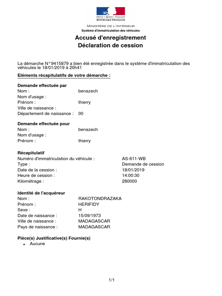 Accusé enregistrement cession véhicule. Déclaration de cession en ligne des pièces exigées. Tout dabord laccusé de déclaration de cession permet au vendeur denregistrer la transaction dans le Système dImmatriculation des Véhicules SIV. En effet il ne sera pas pris pour responsable dans le cas dune infraction causée par le véhicule.